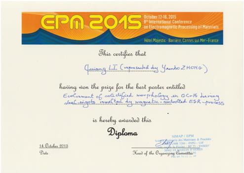 2015年10月12 -16日,第八届国际材料电磁加工会议(The 8thInternational Conference on Electromagnetic Processing of Materials-EPM 2015)在法国戛纳举行,这是国际上材料电磁加工领域最重要的国际会议,来自国际上二十个国家的近200名著名学者和研究人员参加了本次会议。会议采用无记名投票方式选出2名最佳墙报奖获奖者(Best Poster Award)。黑人巨大精品欧美_黑人巨大精品欧美黑寡妇_黑人巨大精品欧美一区二区_黑人巨大精品欧美一区二区免费_黑人巨大跨种族video_黑人巨大无码中文字幕无码_黑人巨茎大战俄罗斯美女_黑人巨茎大战俄罗斯美女材料学院钟云波研究员指导的博士研究生李强同学投稿参加了此次大会,并获得了这一殊荣,另一名获奖者来自德国。