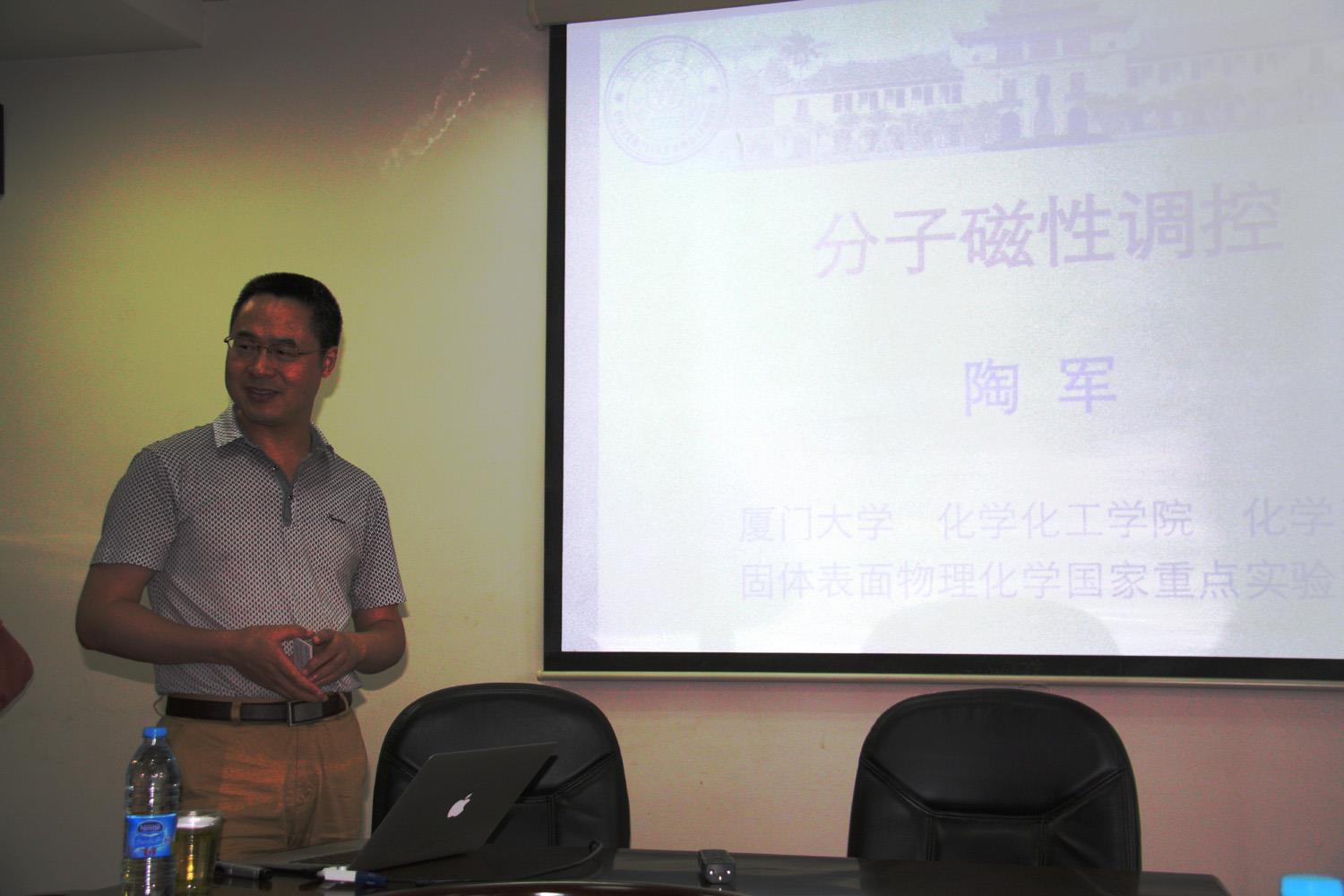 2014年5月17日,厦门大学陶军教授应邀访问理学院,并于上午十点在在校本部F307为学院师生作了题为"分子磁性调控"的学术报告。本次报告为理学院"当代科学前沿讲坛"第195讲。报告由理学院副院长方建慧教授主持。